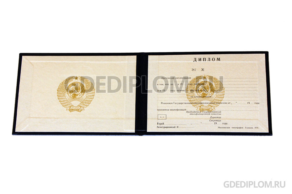 Диплом СПО старого образца СССР с выпуском с начала 1970-х (можем сделать и более ранний период) до 1996 года включительно. Документ выдавался в техникумах СССР, а также в России до выхода Российских дипломов. Заполняется от руки чернилами, закрепляется мокрой гербовой печатью РСФСР (после распада СССР с 1992-1993 года заверялся печатями РФ с двуглавым орлом), правильными подписями, образовательная программа по выбранной специальности соответствуют указанному периоду. Доставка бесплатно курьером, оплата при получении.